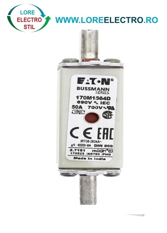 170M1564D Siguranta fuzibila ultrarapida MPR 50A, NH 000, curba ardere gR, 690 V AC, capacitate de rupere 200 kA, Eaton Bussmann,