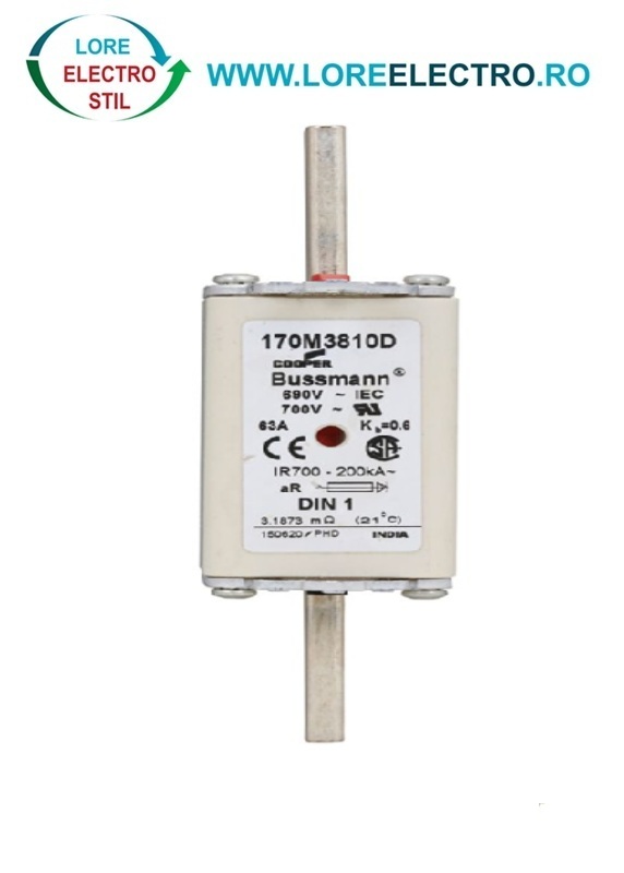 170M3810D Siguranta fuzibila ultrarapida MPR 63A, NH 1, curba ardere aR, 690 V AC, capacitate de rupere 200 kA, Eaton Bussmann,