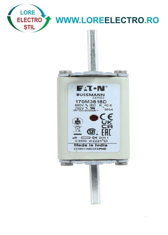 170M3818D Siguranta fuzibila ultrarapida MPR 350A, NH 1, curba ardere aR, 690 V AC, capacitate de rupere 200 kA, Eaton Bussmann,