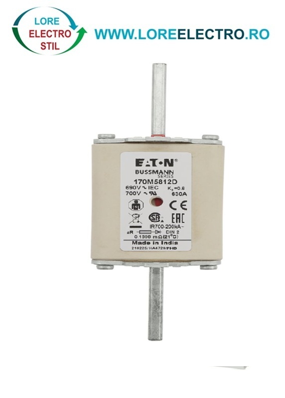 170M5812D Siguranta fuzibila ultrarapida MPR 630A, NH 2, curba ardere aR, 690 V AC, capacitate de rupere 200 kA, Eaton Bussmann,