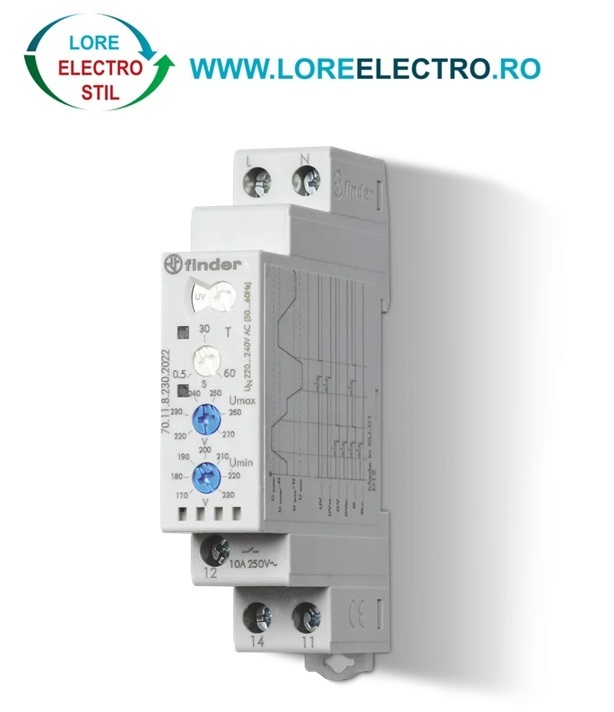 701182302022 RELEU SUPRAVEGHERE TENSIUNE MONOFAZATA, TENSIUNE MAXIMA, MINIMA REGLABILA, INTARZIERE,8A, FINDER,