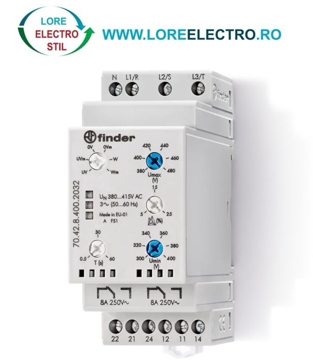 Releu retea trifazata, releu RSTN, releu asimetrie, releu Cadere Faza, releu de tensiune trifazata, releu lipsa faza, releu Finder Supra tensiune, releu sub tensiune, releu monitorizare tensiune trifazaata, finder 704284002032, 704284002032, 704284002032 Finder,