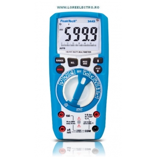 P3443 MULTIMETRU DIGITAL APARAT MASURA TENSIUNE IP67 DISPLAY LCD MAX 1000V AC/DC, MAX. 20A AC/DC, OHMETRU MAX. 60 MOhm, Frecventa 10KHz, Capacitate 4000 MicroF TEMPERATURA 760 grade C, PRODUCATOR PEAK TECH