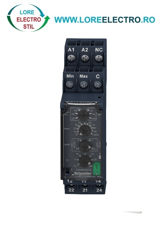 RM22LA32MR, releu de monitorizare a nivelului de lichid Schneider Harmony, functioneaza in intervalul 24-240 V AC/DC (50/60Hz), 2 contacte inversoare (C/O), capacitate de comutare 8A, monitorizeaza nivelul de lichide,